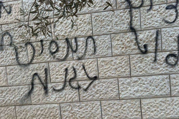 Beldedeki el-Hacce Hamide Camii'ni ateşe veren saldırgan İsrailliler, caminin duvarlarına ırkçı yazılar yazdı.
