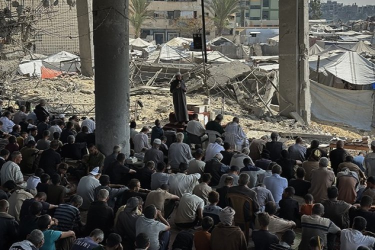 Terörist İsrail'in iki yıl boyunca soykırım yürüttüğü Gazze Şeridi'ndeki yüzlerce Filistinli, saldırılarda tamamen veya kısmen tahrip edilen camilerin enkazı üzerinde aylar sonra cuma namazı kıldı.