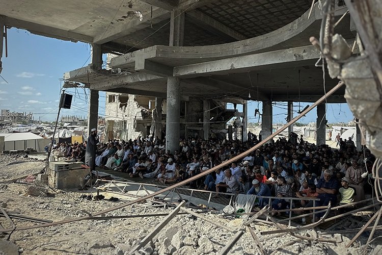 Bazı mahallelerde aylarca minarelerin sessiz kalmasının ardından Filistinliler, camilerdeki enkazın bir kısmını elleriyle temizleyip, yere basit kumaşlar sererek cuma namazı kıldı.